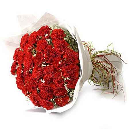 Red carnations when gifted to someone conveys them a message that ‘my love is all yours and nothing can set us apart’. Let your love be cherished with this beautiful bouquet of 25 red carnations bunch white crape paper packing with red rafia knot same as picture.