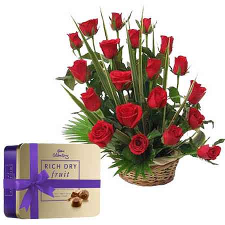 Whether you want to wish good luck to the ones you love or it is the time before examinations just send them your good wishes in form of this wonderful gift. Gift this designer bouquet of 20 red roses one sides basket with Cadbury celebrations pack Mrp Rs.500/-.