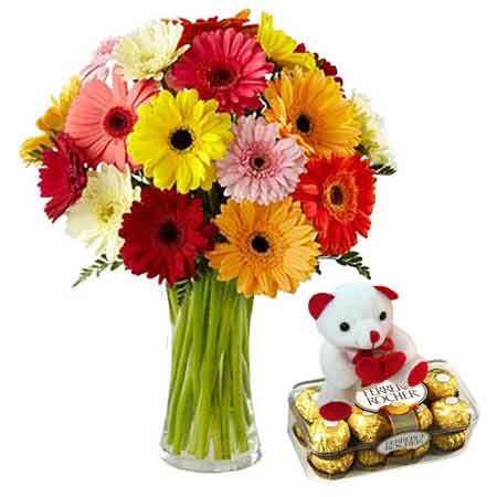 A wonderful gift hamper that the receiver would love to receive and the sender would love to offer. Send online as a gift or purchase this wonderful combo of 6" inch adorable teddy, a beautiful bouquet of 15 mix gerberas in glass vase and delicious 16 pcs ferrerorocher chocolates.