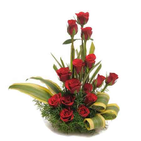Red roses not only look charming but also have a very pleasing and sharp smell that fills every heart with happiness and mesmerizing aroma. Send this long remembered gift of very stunning 15 red roses in a basket dracaena leaves n green fillers.