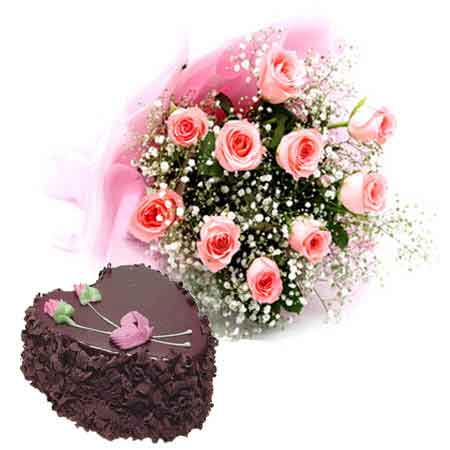 Happiness and love can be shown together with a wonderful gift of flowers. Send this beautiful set of ten pink roses in a paper pack along with delicious one kg heart shape chocolate truffle cake. Perfect for all celebrations of love, this gift can be personalized with a lovely message.