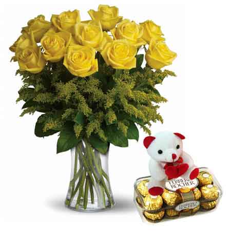 Yellow roses are associated with friendship, happiness and love. For all your friends who are like oxygen your life we present this beautiful combo of 12 bright yellow roses in glass vase along with a huggable and adorable 6" inch teddy and 16 pcs ferrero rocher chocolates.