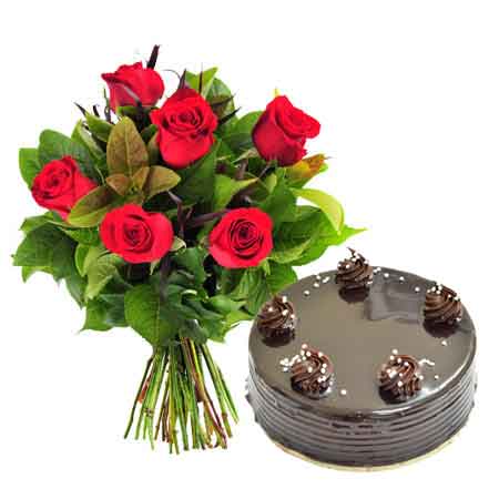 Roses speak the language of love and romance. Propose her once again to fall in love with you with this amazing gift set of six red roses in a bunch and a half kg ultimate chocolate cake. This freshly baked cake consists of layered chocolate sponge base and crunchy chocolate chips.