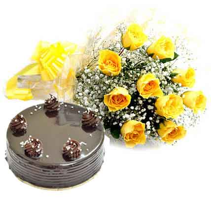 Let your dearones know about your deep feelings and heartfelt emotions with a wonderful unch of flowers and a special treat. Gift them this wonderful pack of half kg round shape Chocolate truffle cake that is prepared only with the finest ingredients along with a very stunning and shining 10 yellow roses bunch.