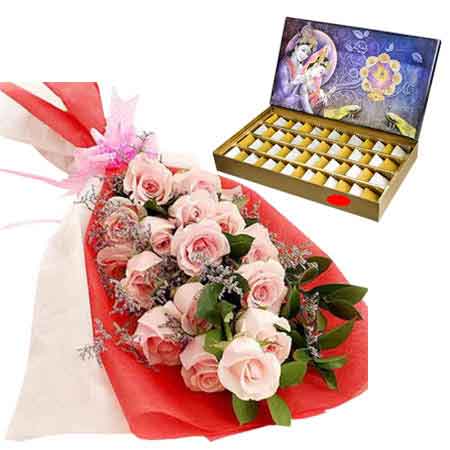 An elegant gift hamper for all kinds of special occasions such as Birthdays, get-together, Farewells, anniversary etc. we have a beautiful bouquet of 18 beautiful pink roses in one sided arrangement that has double layered red & pink paper packing along with one kg kajukatli sweets.