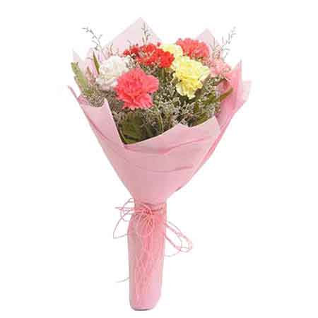 A beautiful bouquet of fresh and gorgeous flowers can be a simple yet very elegantgift. Surprise all your guests and declare your feelings of love to your special one with a designer bouquet of 10 mix carnations pink paper packing bunch with pink ribbon bow.