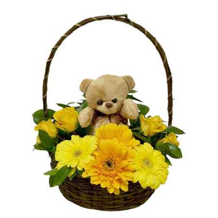 A special gift for a naughty prince! Let them be delighted with a very amazing gift set of 5 yellow roses & 5 yellow gerberas with 6” inch cute teddy bear in a handle cane basket to his life full of good luck and well wishes.