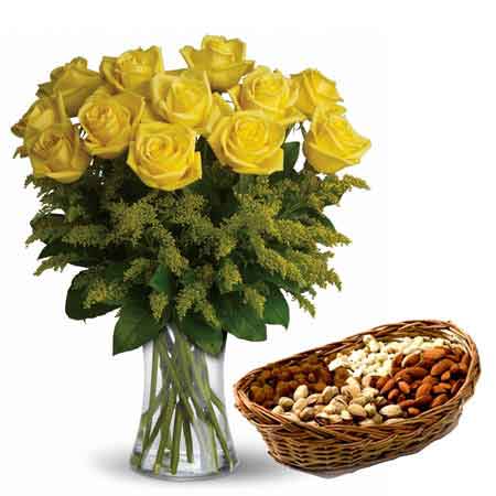 Dad is the best friend of every child with whom we can share every secret. Let us make him feel delighted and proud by gifting them this very delighting gift hamper of 12 yellow sizzling roses decorated in a glass vase and half kg dry fruits in a cane basket.