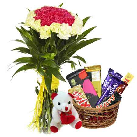 A daughter is a priceless gift of god for every father. So let her know she is a blessing for you by gifting her a combo gift of 8 red & 12 yellow carnations layered bunch with greens, lovable 6" inches of teddy bear and mouth melting assorted chocolates in a cute cane basket.
