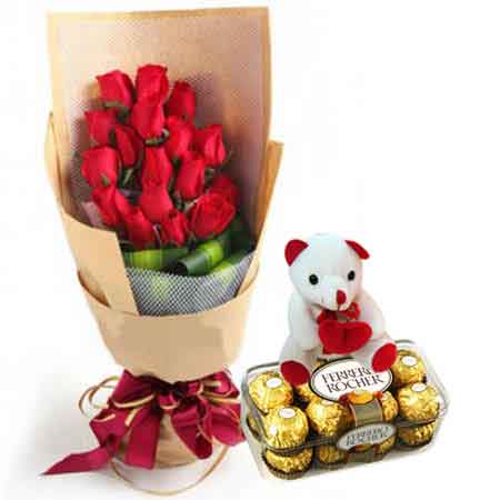 A life partner is a blessing and special gift of god who is made especially for us. If you want to convey this same message to your partner of love and life then gift them this very amazing set of 15 charming red roses in one sided brown paper packing bunch, 6" cute teddy and 16 pieces of ferrerorocher chocolates.