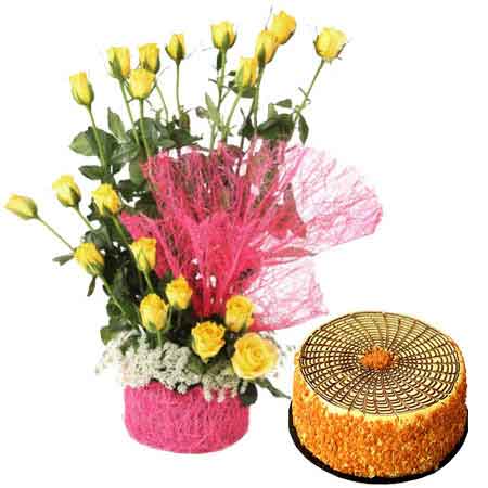 We all know the values of a friend in our life. So if this relation is so unique then why select an ordinary gift. Go ahead with this very pleasing gift set of 20 yellow beautiful roses in a basket arrangement decorated with pink joot mat and a scrumptious half kg butter scotch cake prepared from fresh vanilla creams, delicate sponge garnished with butter scotch crunches.