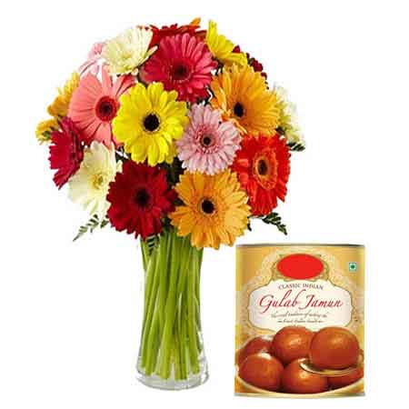 Let your friends and family experience that you are not just thinking about them but also your love is never ending for them. Surprise them with this delighting gift combo of 10 mix fresh gerberas in a glass vase and 1 kg branded tin very delicious gulabjamun by ordering it exclusively from flowerncakegallery.com.