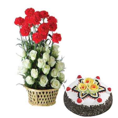 A gift that will help you to share happiness with your special ones! Send as a gift or purchase this very cheerful gift combo including fresh and beautiful 15 red carnations, 25 white roses in a tier basket arrangement and a very appealing, delicious half kg black forest chocolate filled cake.
