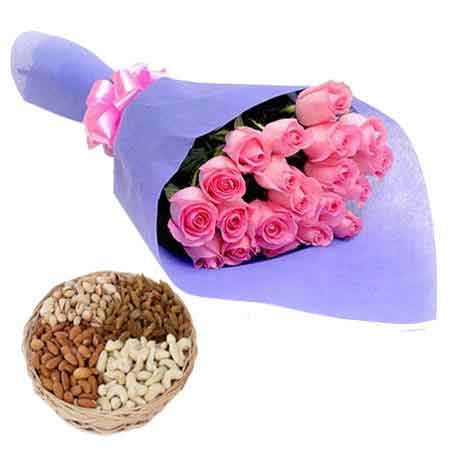 Get online thiswonderful combo gift that comprises of 15 pink beautiful roses in a blue paper packing bunch with a pink ribbon bow & half kg delicious dry fruits in a cane basket and gift it to say ‘We will always remember you’ to a colleague and a friend who is going to be retired soon.