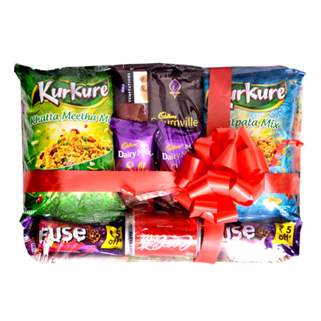 ONE KURKURE MIX NAMKIN 35/-, ONE KURKURE KHATTA MEETHA NAMKIN 35/-,TWO SILK 70/-EACH,TWO FUSE CHOCOLATE 30/- EACH, ONE COCA COLA CANE 25/-,ONE BOURNVILLEY 99/-,ONE TEMPATATIOM 89/-
