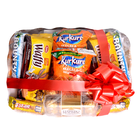 TWO WAFFER 45/-,TWO KURKURE 10/- EACH,TWO FIVE STAR CHOCOLATE 10/- EACH,16 PCS FERERO ROCHER 440/-,TWO BOUNTY 45/-
