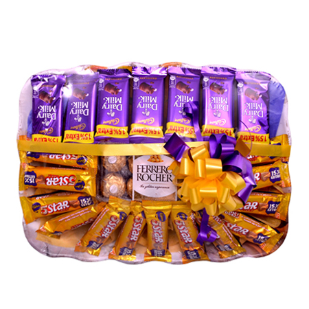 7 PCS DAIRY MILK CHOCOLATE 10/-EACH, 13 PCS FIVE STAR CHOCOLATE 10/-EACH,16 PCS FERERO ROCHER BOX.