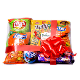 ONE WAFFER,TWO KURKURE, ONE LAYS, ONE GEMS BAL, ONE HIDE & SIKE , ONE FRUITY, ONE TROPICANA.