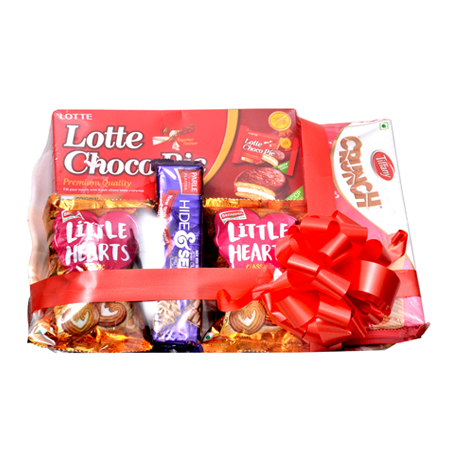 ONE TIFFINY CRUNCH, 2 PCS LITTLE HEART, ONE LOTTE CHOCO PIE, ONE HIDE & SIKE.