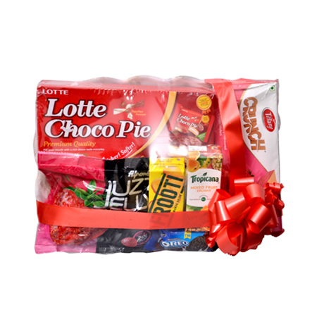 ONE TIFFINY CRUNCH, ONE LOTTE CHOCO PIE, ONE OREO BISCUITS, ONE FRUITY, ONE TROPICANA, JUZT JELLY.