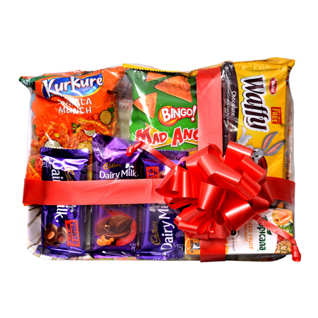 ONE WAFFER, ONE KURKURE, ONE TROPICANA, ONE BINGO MAD ANGLE, 2 PCS FRUITS N NUTS, EACH,ONE SILK.