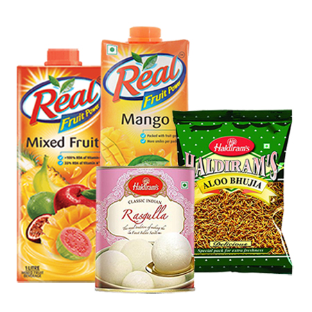 2pcs 1 ltr REAL JUICE, 400gms HALDIRAM ALOO BHUJIA, 1KG HALDIRAM RASGULLA.