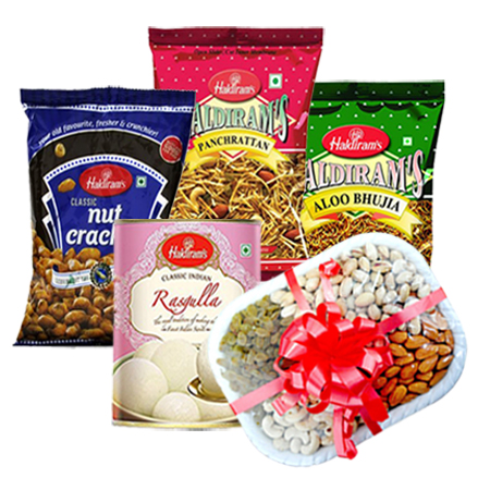 400gms HALDIRAM PANCHRATAN NAMKIN, 400gms HALDIRAM ALOO BHUJIA, 400gms HALDIRAM NUT CRACKER, 1KG HALDIRAM RASGULLA, HALF KG ASSORTED DRY FRUITS.