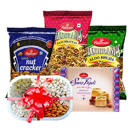 400gms HALDIRAM PANCHRATAN NAMKIN, 400 gms HALDIRAM ALOO BHUJIA, 400gms HALDIRAM NUT CRACKER, HALF KG HALDIRAM SOHAN PAPRI, HALF KG ASSORTED DRY FRUITS.