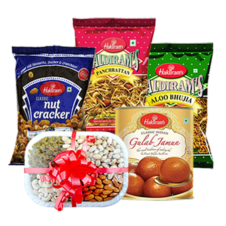 400gms HALDIRAM PANCHRATAN NAMKIN, 400 gms HALDIRAM ALOO BHUJIA, 400gms HALDIRAM NUT CRACKER, 1KG HALDIRAM GULAB JAMUN, HALF KG ASSORTED DRY FRUITS.