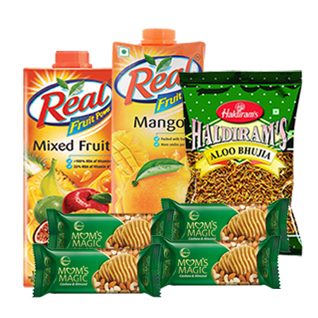 2pcs 1 ltr REAL JUICE, 400gms HALDIRAM ALOO BHUJIA, 4pcs MOMS CHOICE COOCKIES.