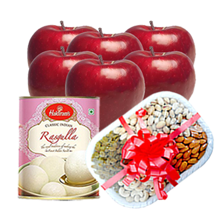 6 pcs APPLE, HALF KG ASSORTED DRY FRUIT, 1 KG HALDIRAM RASGULLA.