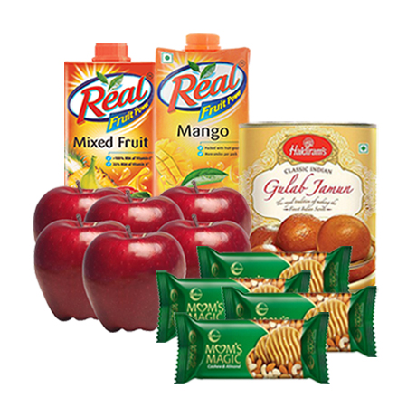 6 pcs APPLE, 2pcs REAL JUICE, 1 KG HALDIRAM GULAB JAMUN, 4pcs MOMS CHOICE COOCKIES.