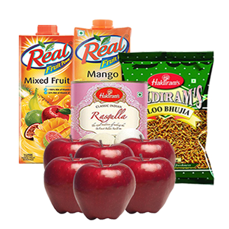 6 pcs APPLE, 2pcs REAL JUICE, 400gms HALDIRAM ALOO BHUJIA, 1 KG HALDIRAM RASGULLA.
