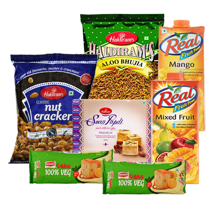 400 gms HALDIRAM ALOO BHUJIA 87/-, 400gms HALDIRAM NUT CRACKER 89/-, 2pcs 1 ltr REAL JUICE@100/-, HALF KG SOHAN PAPRI 130/-, 2pcs BRITANIA CAKE@30/-