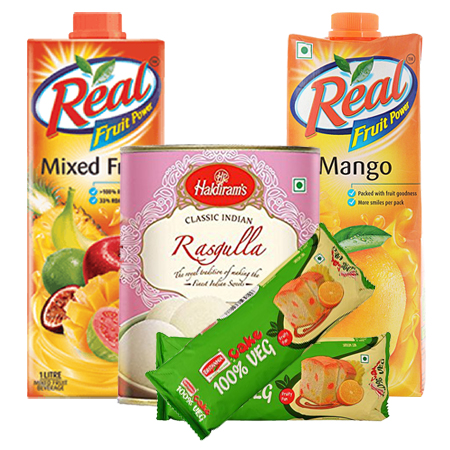 2 * 1 LTR REAL JUICE, 1KG HALDIRAM RASGULLA, 2 PCS BRITANIA CAKE.