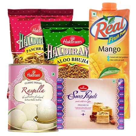 400 GMS HALDIRAM KHATTA MITHA NAMKIN, 400 GMS HALDIRAM ALOO BHUJIA, 1 LTR REAL JUICE, 1KG HALDIRAM RASGULLA, HALF KG HALDIRAM SOHAN PAPRI,