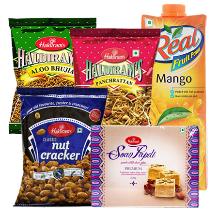 400 GMS HALDIRAM PANCHRATAN NAMKIN, 400 GMS HALDIRAM ALOO BHUJIA, 1 LTR REAL JUICE, 400 GMS HALDIRAM NUT CRACKER, HALF KG SOHAN PAPRI.