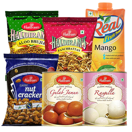 400gms HALDIRAM KHATTA MITHA NAMKIN, 400 gms HALDIRAM ALOO BHUJIA 400gms HALDIRAM NUT CRACKER, 1 ltr REAL JUICE, 1KG HALDIRAM RASGULLA, 1KG HALDIRAM GULAB JAMUN.