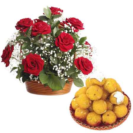 A gift should be such that can be enjoyed by all from kids to adults. Make everyone delighted specially the kids, by gifting this very amazing gift set of very delicious 1 kg motichoorladdu and a very beautiful bouquet of 15 red roses round shape basket arrangement.