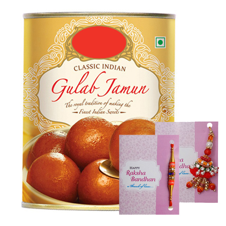 1 kg haldiram gulab jamun and 2 rakhi (lumba rakhi set) with roli chawal.