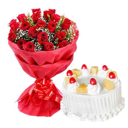 A celebration is incomplete without a gift, so we have a wide range of amazing gifts for you. Let this celebration be a celebrated with a eye catchy gift of 20 red roses bunch in double paper packing of red color and super tasty half kg pineapple cake, prepared from fresh pineapple crushes and moist sponge base.