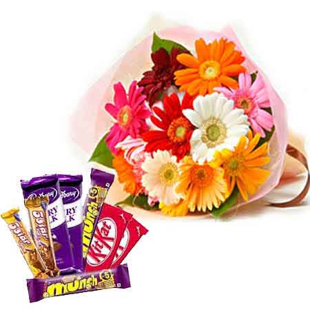It is not always necessary to wait for an occasion to make someone happy. Just gift this very beautiful gift set of 12 mix beautiful and fresh gerberas bunch in a pink color paper packing and 10 assorted chocolates @10/- to your friends and family and let them know that they mean a lot to you.