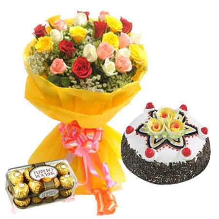 We love the smile that a receiver has on his face after receiving a gift and we believe even you love it too. So this time get this wonderful gift set of mix 25 stunning roses packed together in a bunch withyellow paper packing along with a super soft one kg black forest cake and 16 pcs ferrerorocher chocolates that can make your dear ones smile with love and joy.