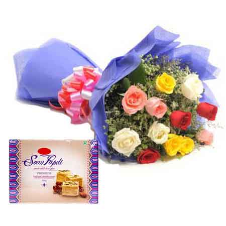 We have a very appealing and inviting gift for the ones who are love of your life. Send them a beautiful and lovable bouquet of 12 mix fresh roses in blue paper packing bunch tied together with a ribbon bow along with a box of half kg soanpapdi 5that is prepared using only best available ingredients.