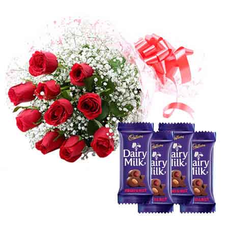 Let your search of an elegant and perfect gift end up here. We are presenting this very awesome gift set of 10 beautiful red roses and 4 Cadbury fruit n nut chocolates @ 40/- each that can be gifted to anyone on all cheerful occasions like Birthday, Christmas, New Year or family get-together.