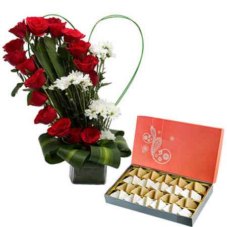 A heart winning and outstanding gift is here for all your friends and family. It is not just outstanding by its looks but also by its aroma and taste. Gift this very amazing gift hamper that consists of a collection of 6 fresh white daisy/gerbera and 18 red roses in a half heart shape glass vase arrangement along with delicious half kg Kajukatli sweets.