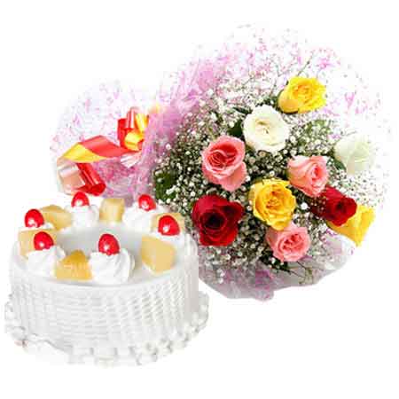 A wondrous gift that can make the day of your loved ones memorable! This very classic hamper consists of delicious half kg round shape pineapple cake made u of delicate sponge base and other fresh ingredients and a fabulous bouquet of 10 mix roses. Order it online today!