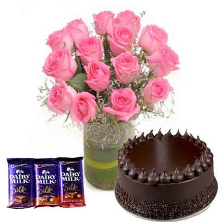 Show gratitude, love and respect to the ones who have given their best to make what you are today. Give them this very amazing and happening combo gift of 15 pink beautiful and broad headed roses in a glass vase arrangement along with a mouth melting half kg chocolate truffle cake and 3 dairy milk silk chocolate of 65/- each.