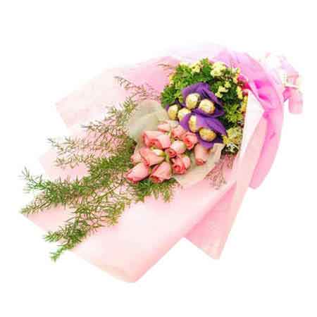 Let your love ones know that they are lucky to have you in their life. Send them inline this very amazing gift of 12 beautiful and fresh pink roses & 5 pcs of mouth melting ferrerorocher chocolates packed together beautifully just like a lovable bouquet.