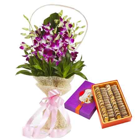 Make your special ones feel blessed with your best wishes. Gift them this very amazing hamper of marvelous eight purple orchids bunch in a joot paper packing tied with pink ribbon and delicious 1 kg kaju anjeer barfi on all and any kind of occasion.